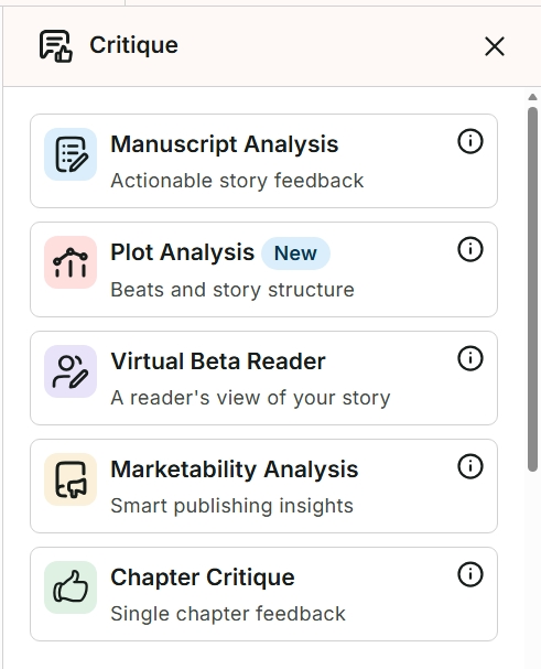 To use Virtual Beta Reader, you will need Story Credits. Virtual Beta Reader uses the same credits as Manuscript Analysis and Marketability Analysis.