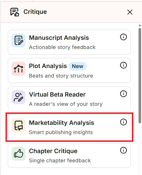 If you’re using a ProWritingAid integration, click the floating ProWritingAid icon. Click on “Critique,” then click on “Marketability Analysis.”