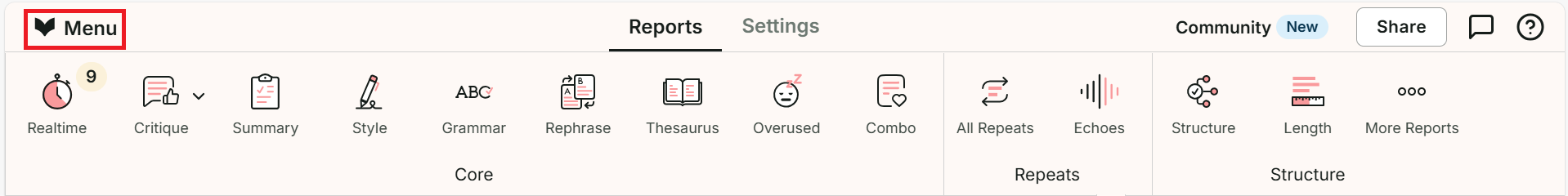 To turn Rephrase off if you’re using the Web Editor, click on the “Menu” button above the toolbar. We have highlighted this button in red in the image below.