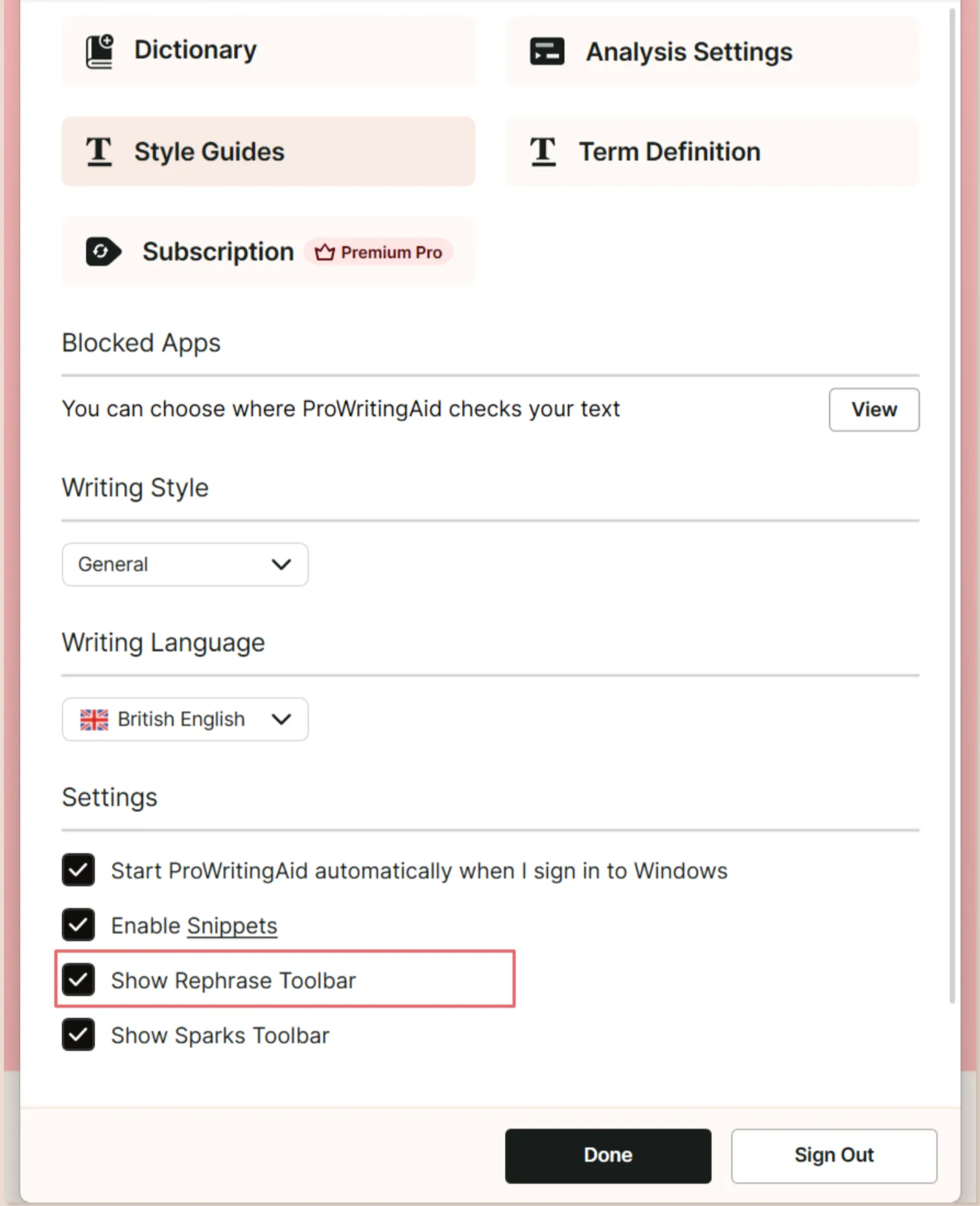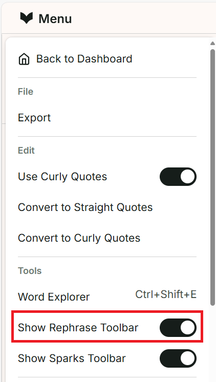 In the drop-down menu, click on the toggle next to “Show Rephrase Toolbar.” We have highlighted this in red in the image below.