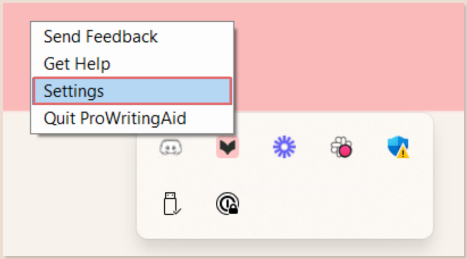 If you’re using ProWritingAid Desktop Everywhere for Windows, click on the ProWritingAid icon in your desktop toolbar. We have highlighted this in red in the image below.