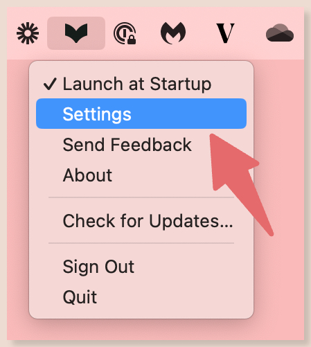 If you’re using ProWritingAid Desktop Everywhere for Mac, click on the ProWritingAid icon in your desktop toolbar, then click “Settings.” We have highlighted this with a red arrow in the image below.