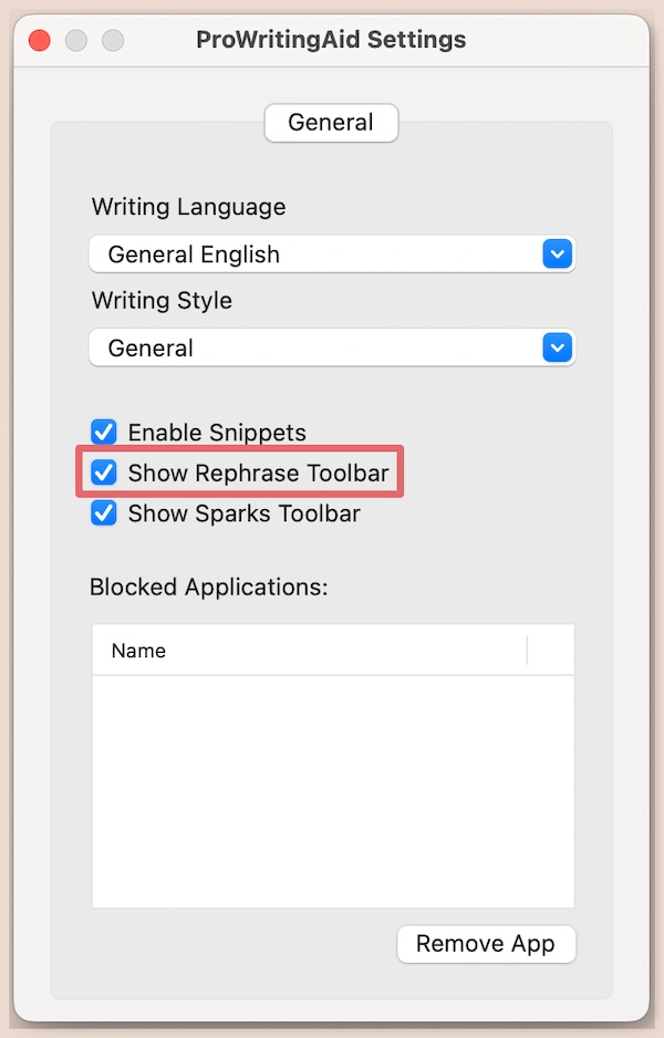 Scroll down to “Show Rephrase Toolbar” and uncheck the box. We have highlighted this in red in the image below.