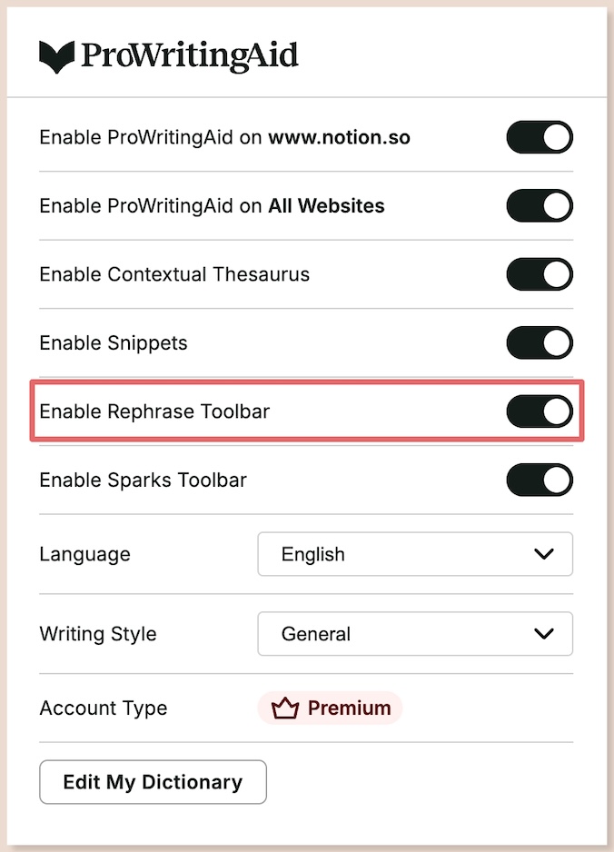 If you’re using one of our browser extensions, click on the ProWritingAid icon in your extensions bar. Then click on the toggle next to “Enable Rephrase Toolbar.” We have highlighted this in red in the image below.