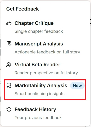 A drop-down menu titled “Get Feedback” will appear. Select “Marketability Analysis” as highlighted in red in the image below.