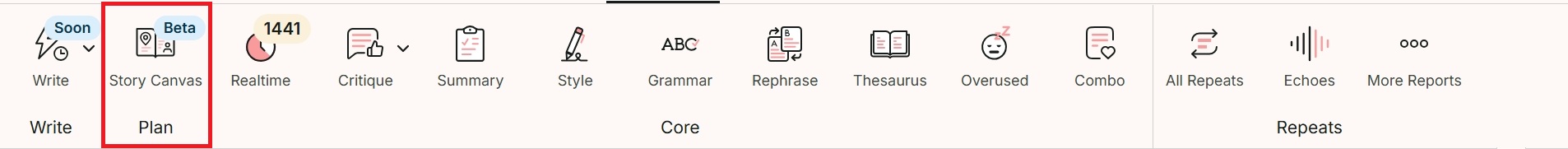 Story Canvas transforms your story idea into a detailed writing plan. To use it, open the Web Editor and click on “Story Canvas” in the toolbar. We have highlighted this in red in the image below.