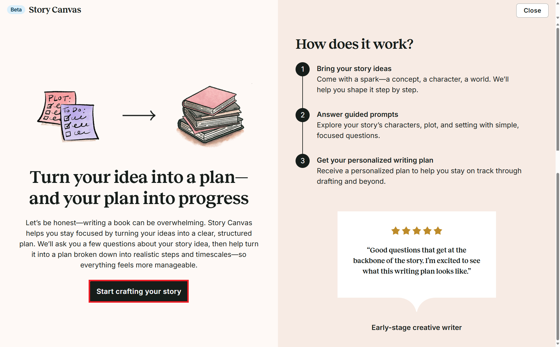 A window will open that explains the three-step process to developing your personalized writing plan. Click on the “Start crafting your story” button to continue. We have highlighted this in red in the image below.