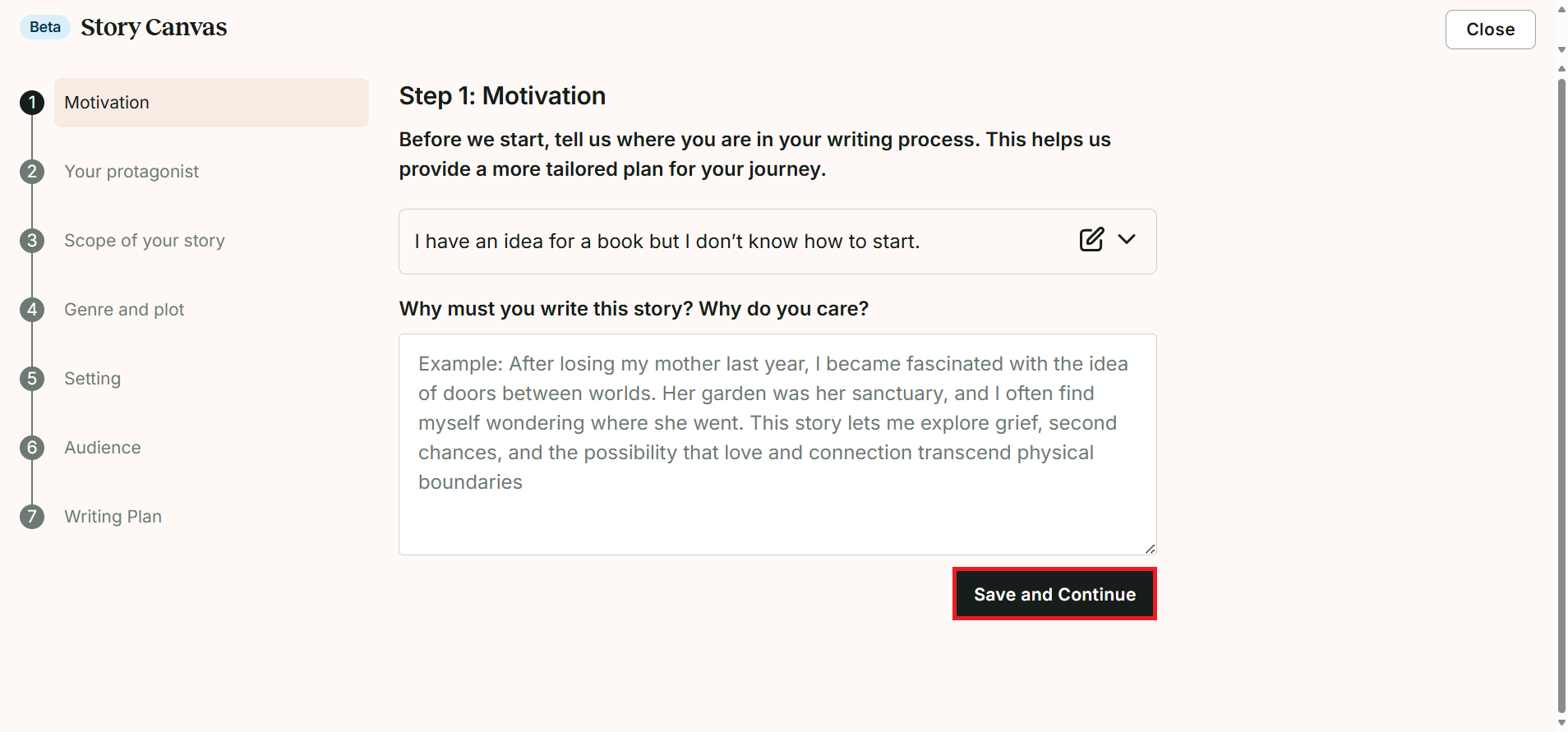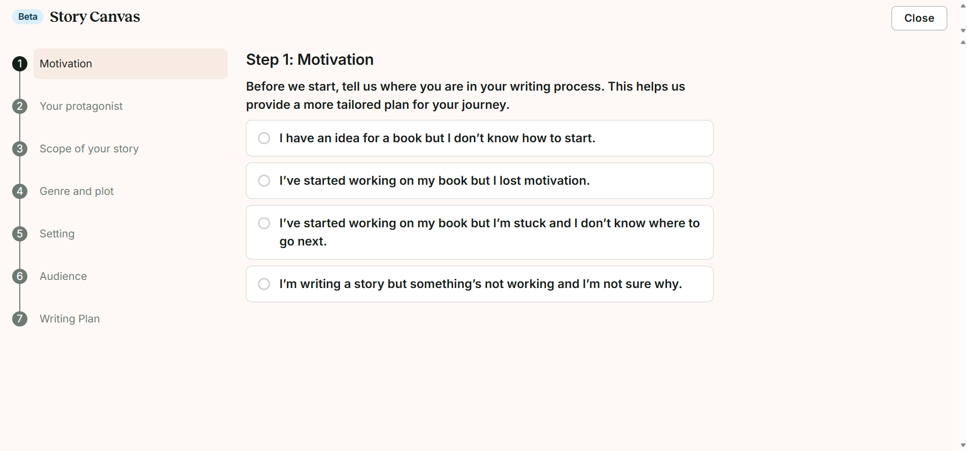 A window will open that contains 7 steps focusing on the key elements and intentions of your story. Within each step, select a response to the request or type an answer to the question. We have shown the start of step 1 in the image below.
