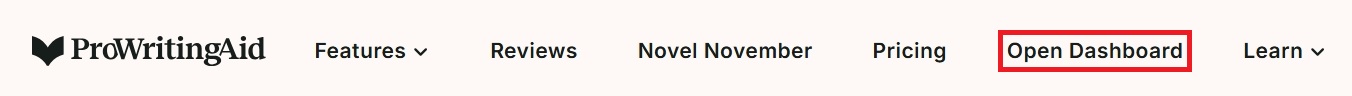 Log in to your ProWritingAid account, then open your dashboard. You can also go to your dashboard at any time on our website. To do this, click on “Open Dashboard” in the top navigation. We have highlighted this in red in the image below.