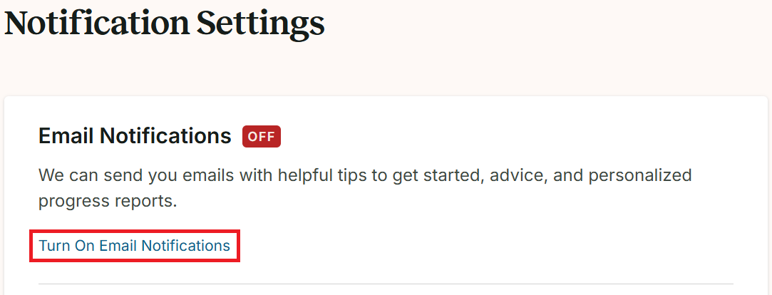 To manage the types of emails you receive from us, your email notifications must be set to “ON.” If they are not, click “Turn On Email Notifications.” We have highlighted this in red in the image below.