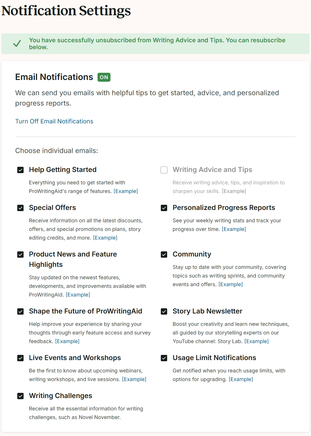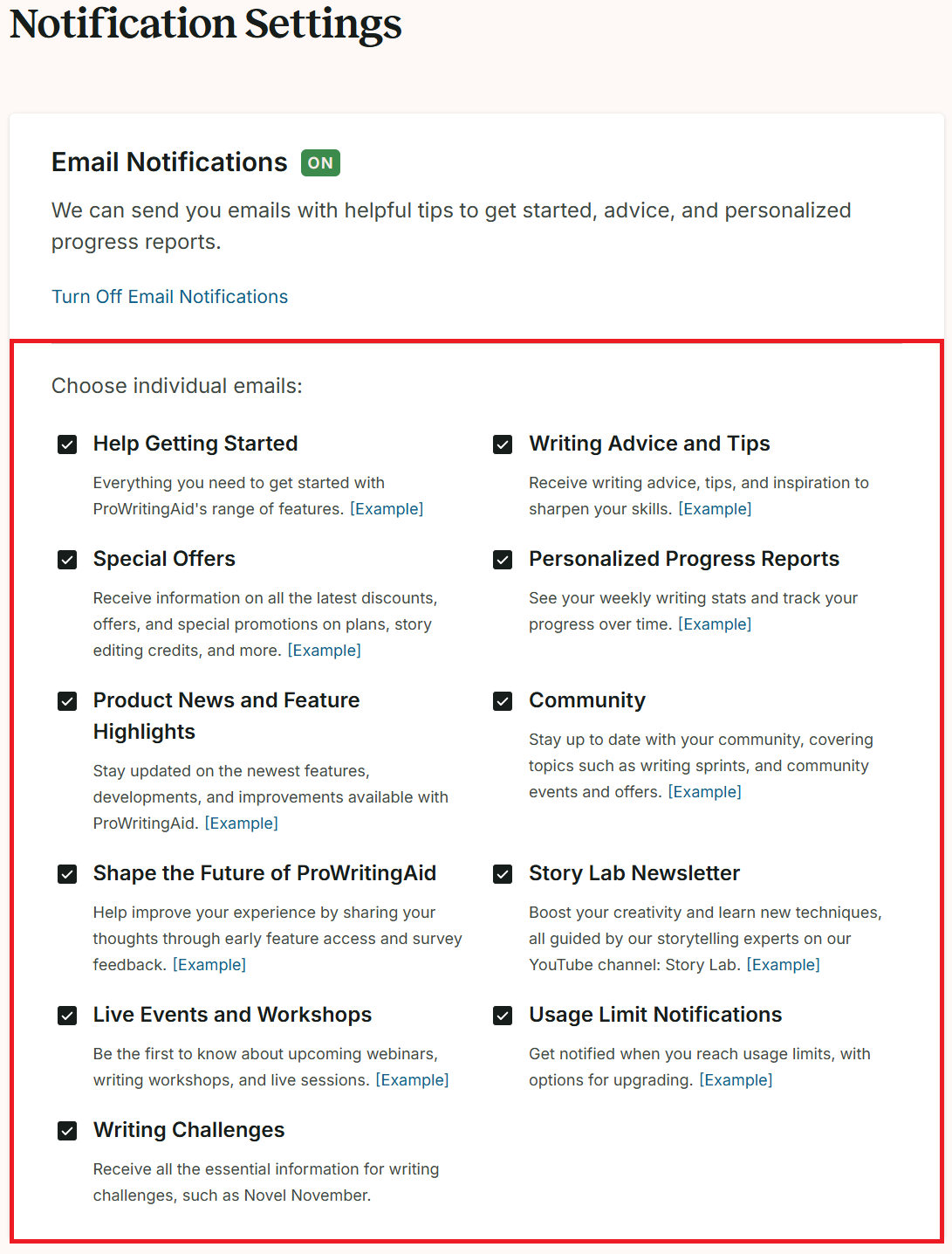 If your email notifications are set to “OFF,” you will not receive any emails from ProWritingAid except essential billing and subscription emails and replies to any Help Center queries you send.