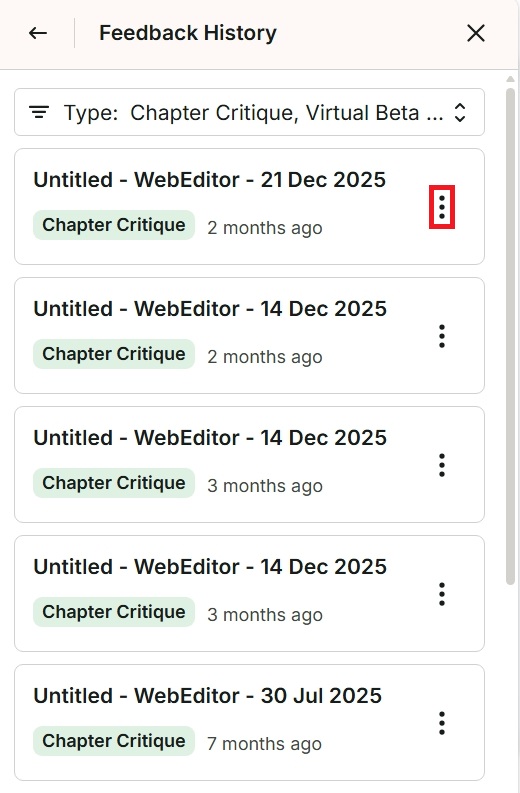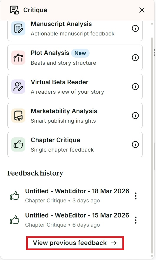 We automatically save all the feedback reports you generate for Chapter Critique, Manuscript Analysis, Marketability Analysis, Plot Analysis, Virtual Beta Reader.